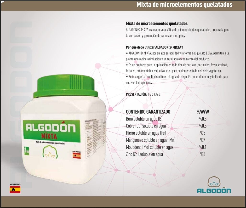 ALGADON® MIXTA, çoklu eksikliklerin düzeltilmesi ve önlenmesi için hazırlanmış, şelatlı mikro besin öğelerinin katı bir karışımıdır.
