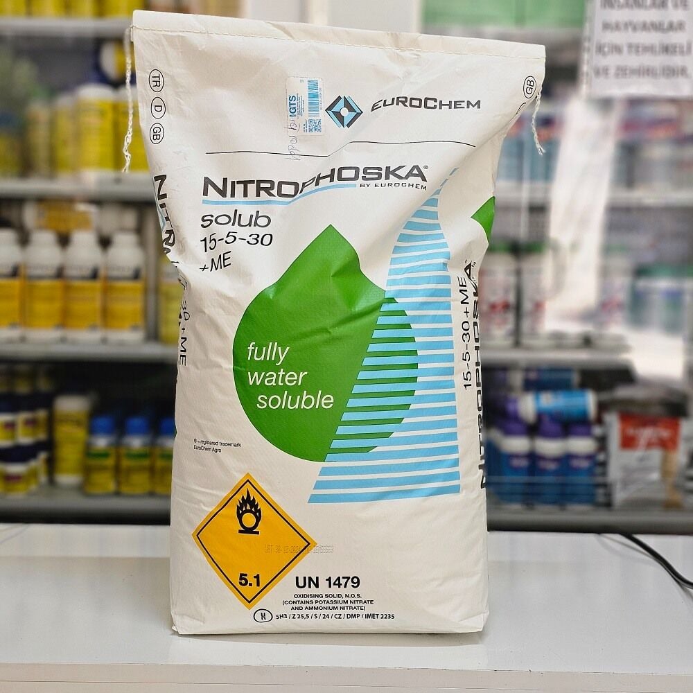 EuroChem Nitrophoska Solub 15-5-30 + ME, yüksek potasyum içeriğiyle özellikle meyve olgunlaşma dönemlerinde tercih edilen, damlama sulama ve yaprak uygulamalarına uygun, klorsuz ve şelatlı mikro elementlerle zenginleştirilmiş bir gübredir. Sebze, meyve ve tüm kültür bitkilerinde güvenle kullanılabilir.