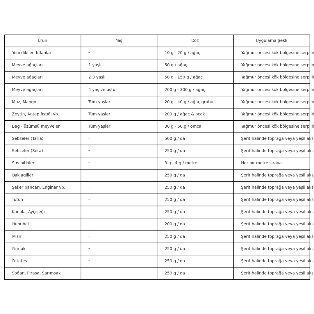 - Tarla Bitkileri: Şerit şeklinde toprak uygulaması veya püskürtme yöntemi ile uygulanabilir.