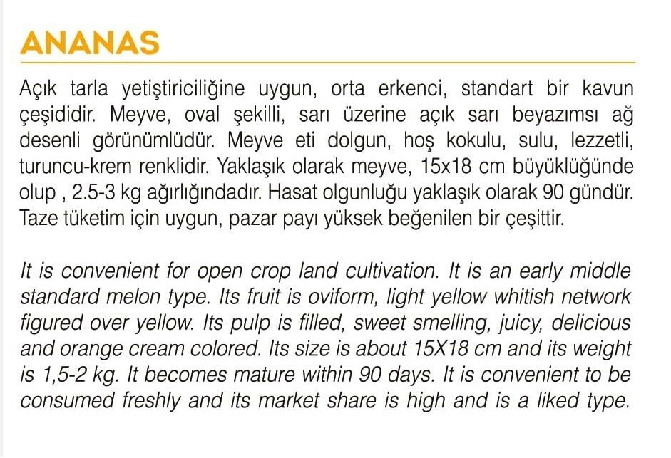 Yerli Doğal Ananas Kavunu Tohumlarımız, Türkiye'nin verimli topraklarından özenle seçilmiştir. Hiçbir kimyasal işlem görmemiş, tamamen doğal ve geleneksel yöntemlerle üretilmiştir. Lezzetli ve besleyici ananas kavunları, sofralarınıza sağlık ve lezzet katacak.