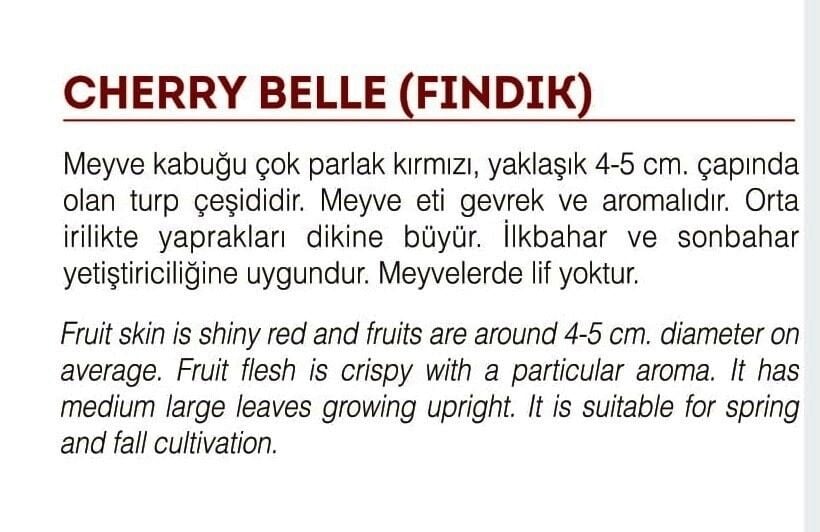 Yerli Doğal Fındık Turp Tohumlarımız, Türkiye'nin verimli topraklarından özenle seçilmiştir. Hiçbir kimyasal işlem görmemiş, tamamen doğal ve geleneksel yöntemlerle üretilmiştir. Lezzetli ve sağlıklı fındık turp bitkileri, sofralarınıza doğal tat ve besin katkıları sunacaktır. 20-30 Günde olgunlaşır ve kahvaltılık turp olarak ta bilinir.