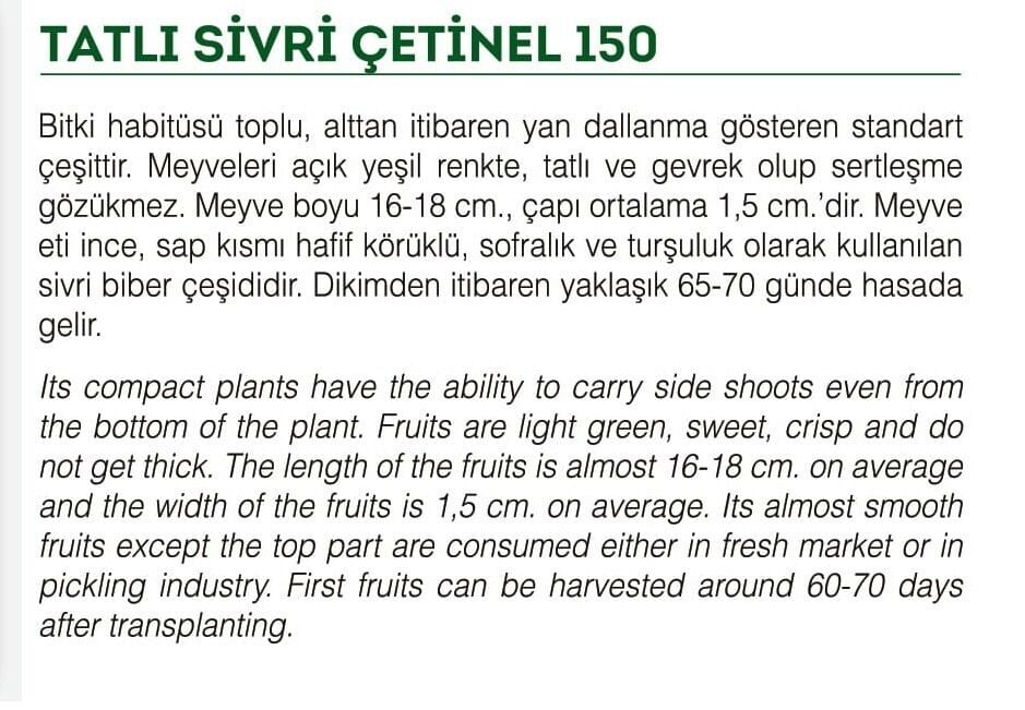 Ürün Tipi: Tatlı Sivri Çetinel Biber Tohumu